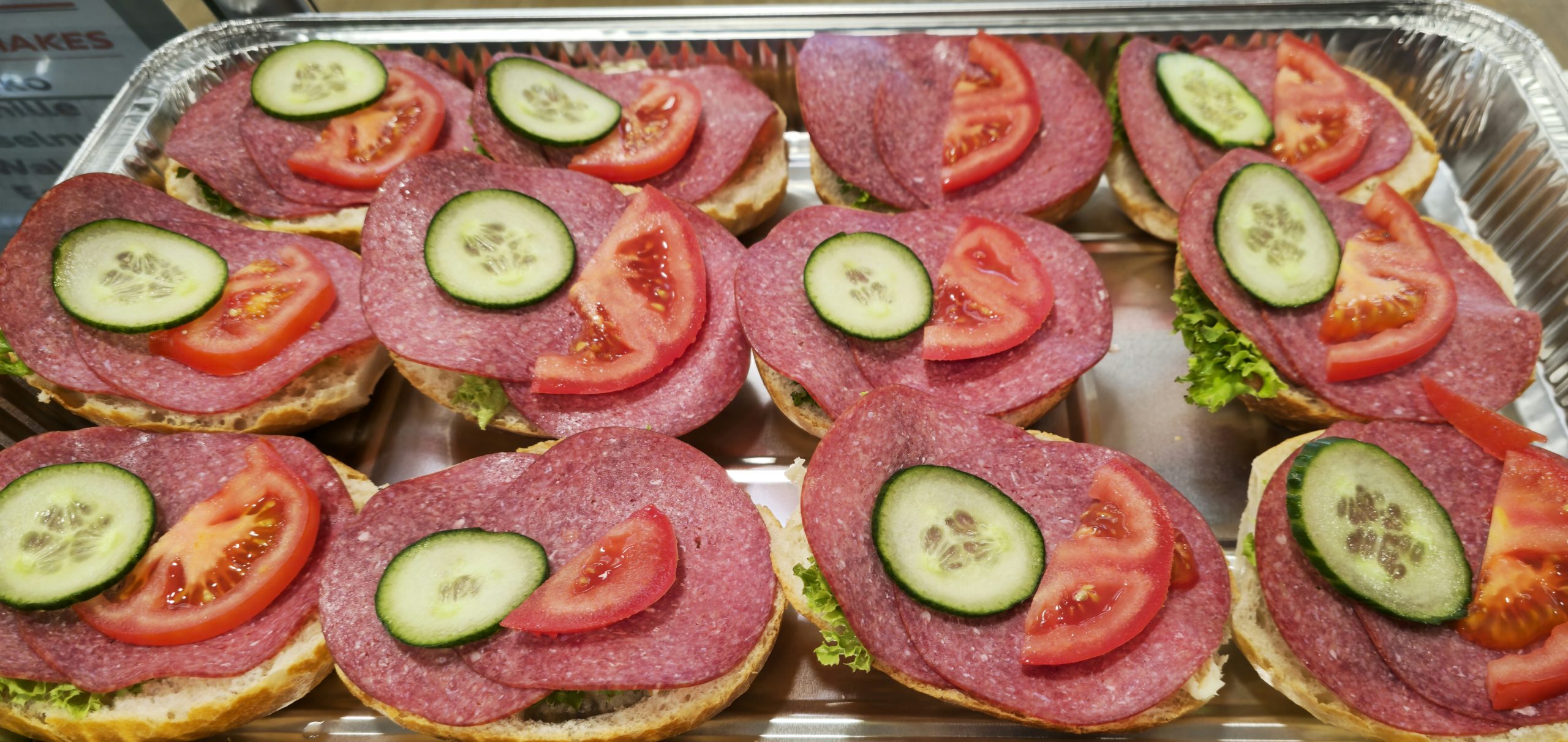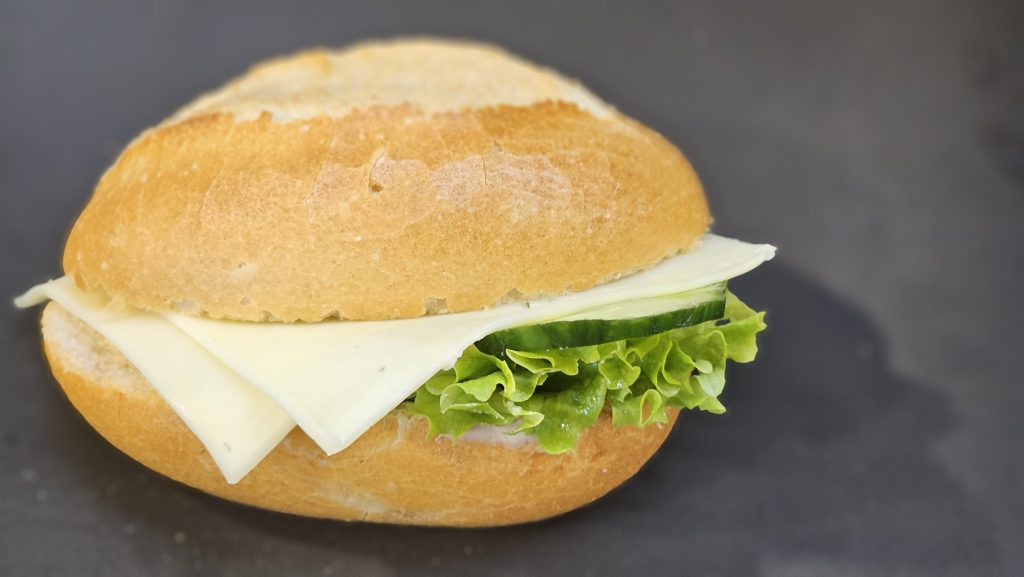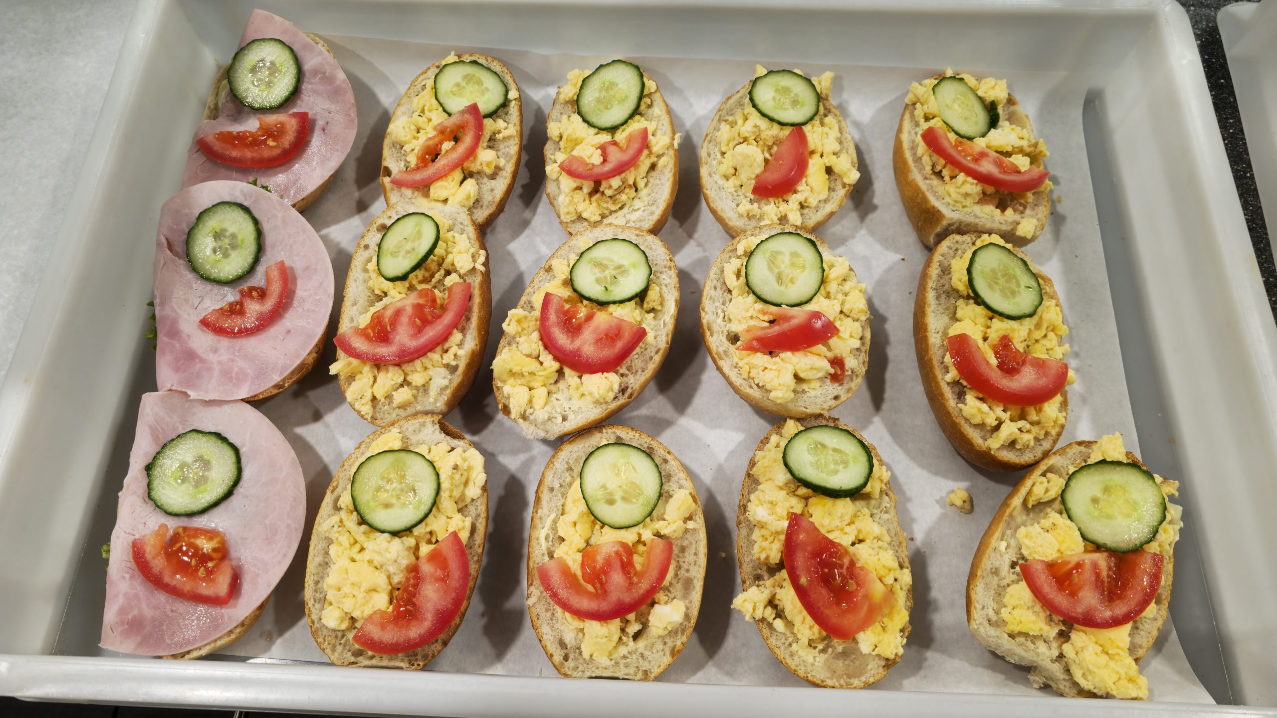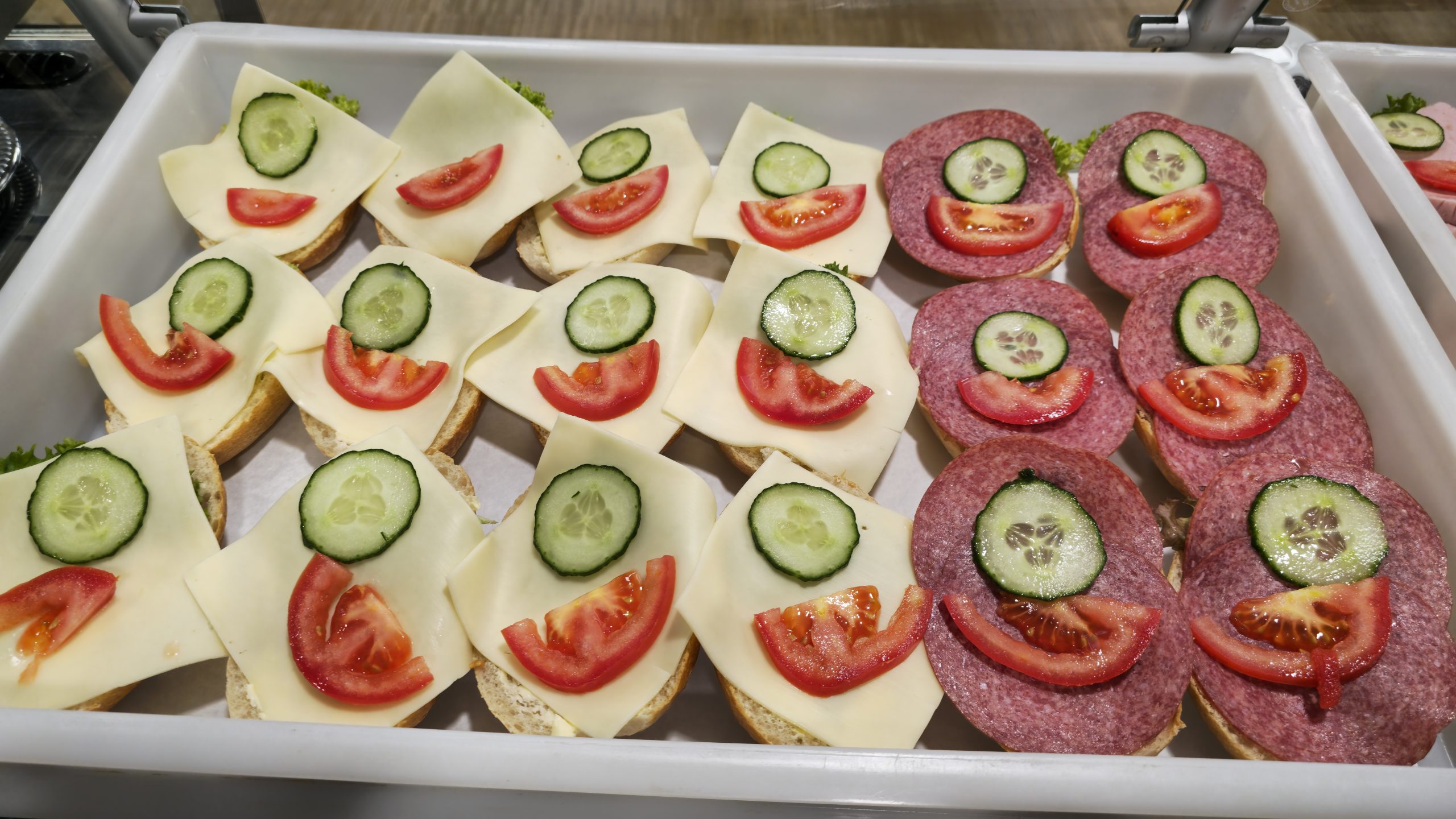 Leicht gebuttert, mit Lollo Bionda ausgelegt und einzeln mit Tomate und Gurke garniert.