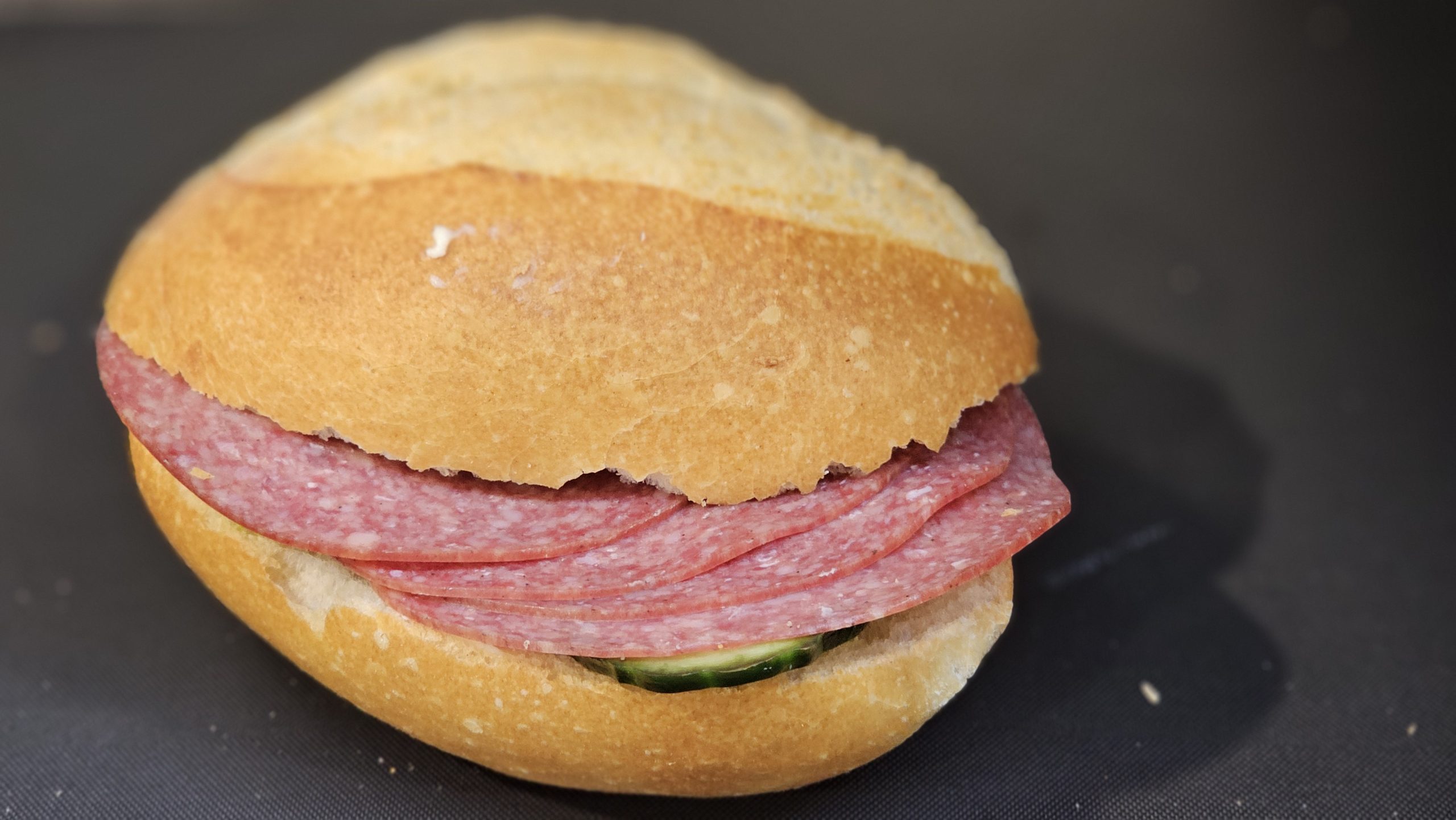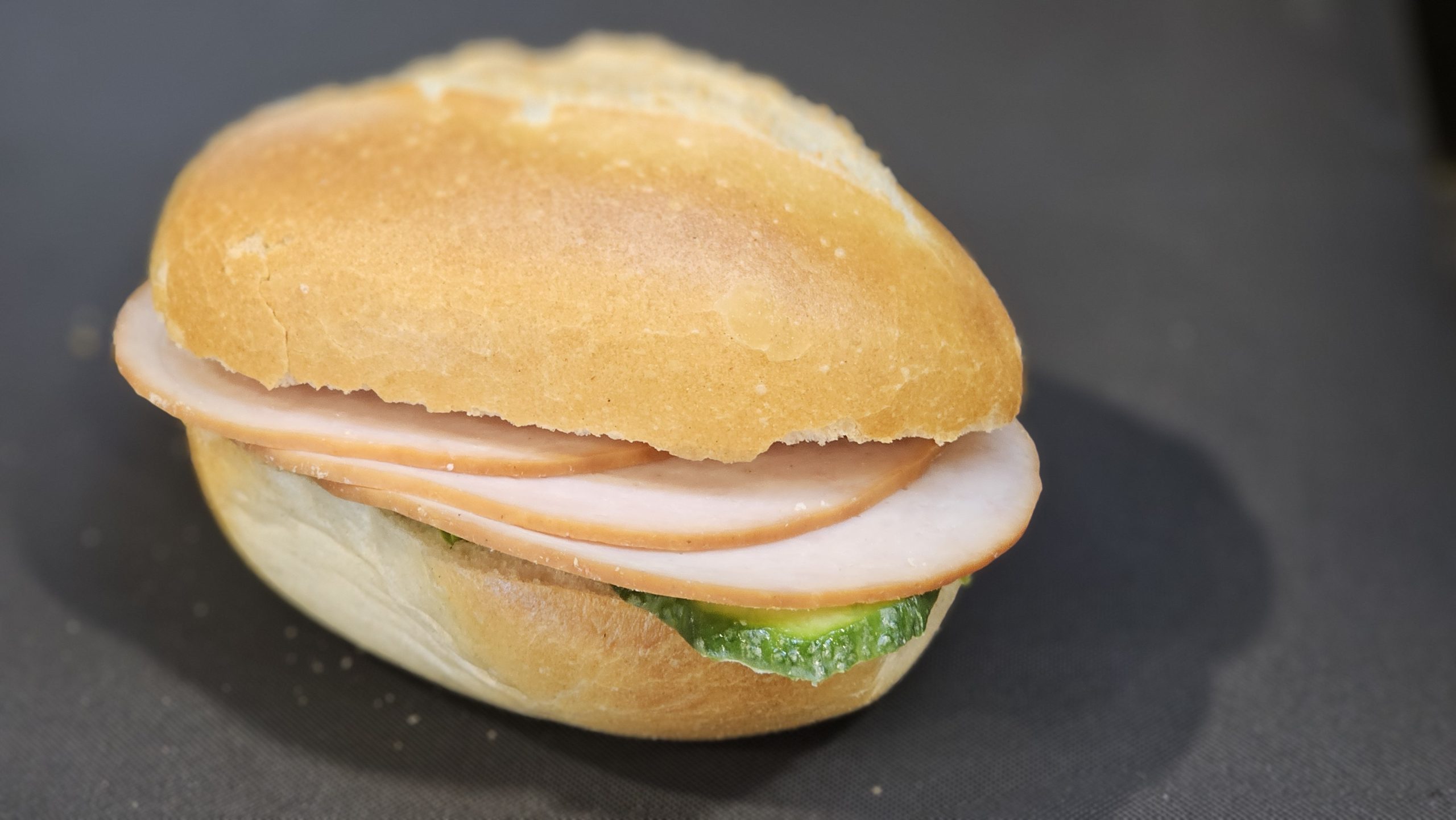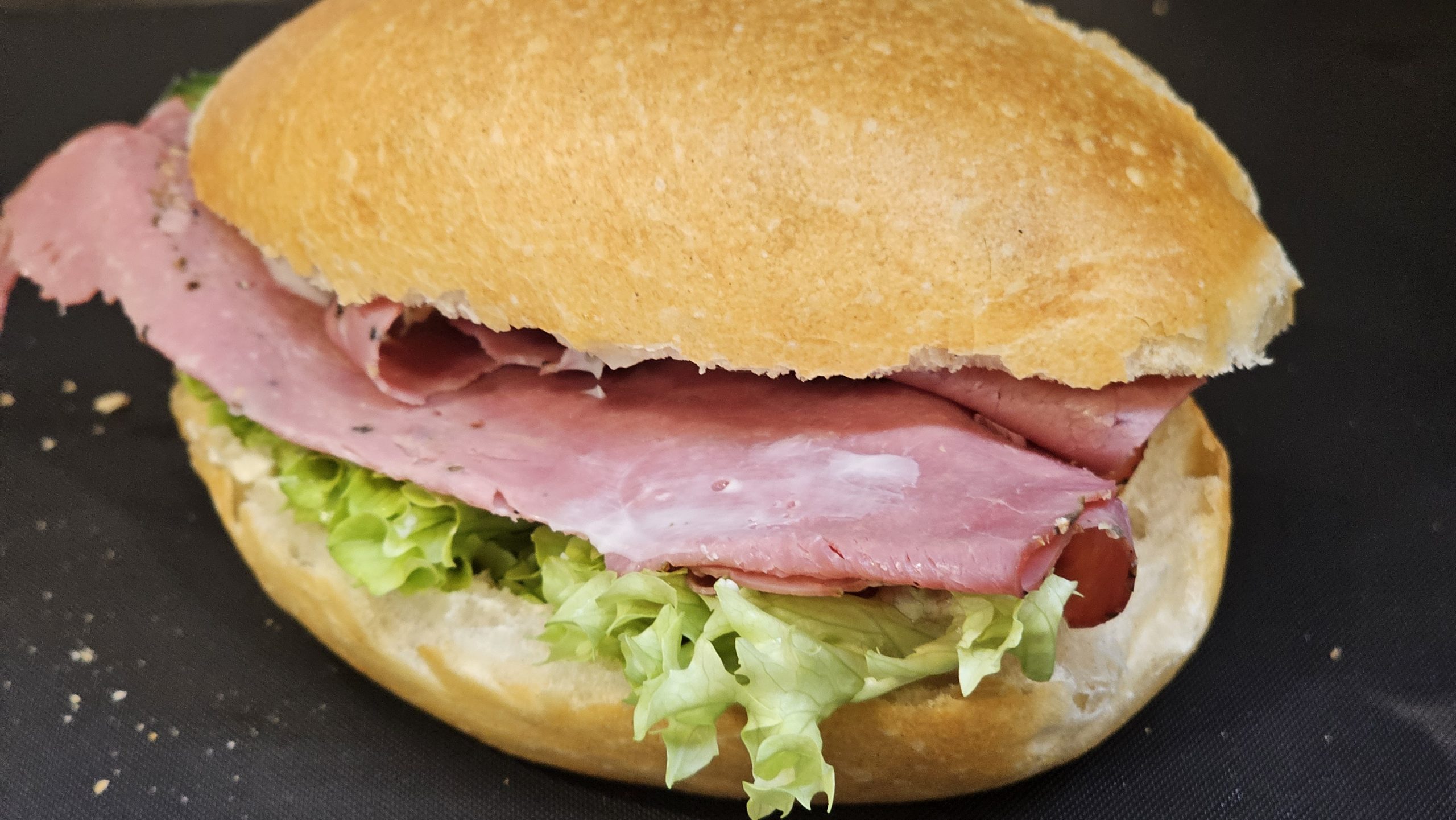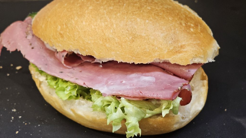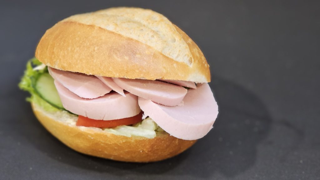 Leicht gebuttert, mit Lollo Bionda ausgelegt und einzeln mit Tomate und Gurke garniert.