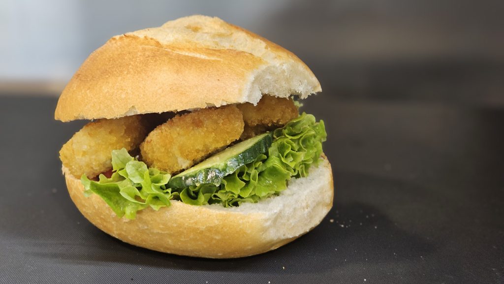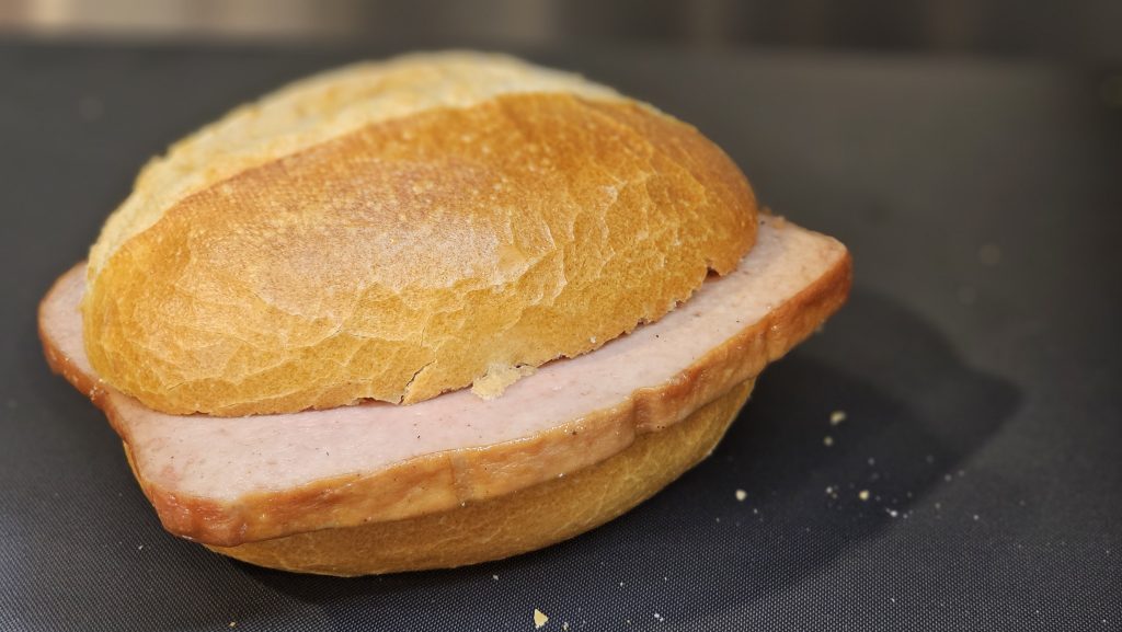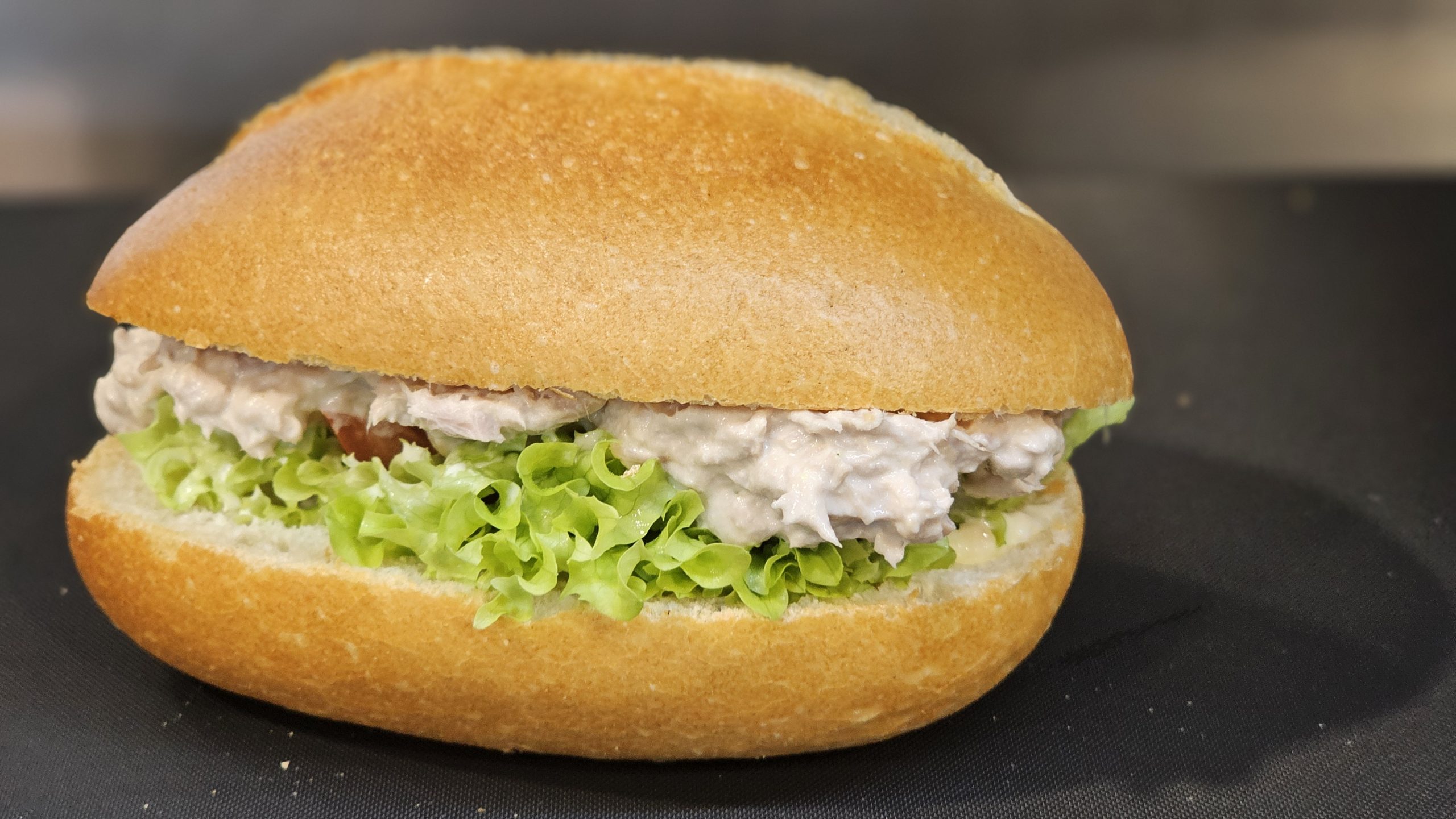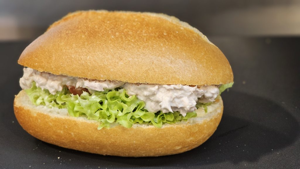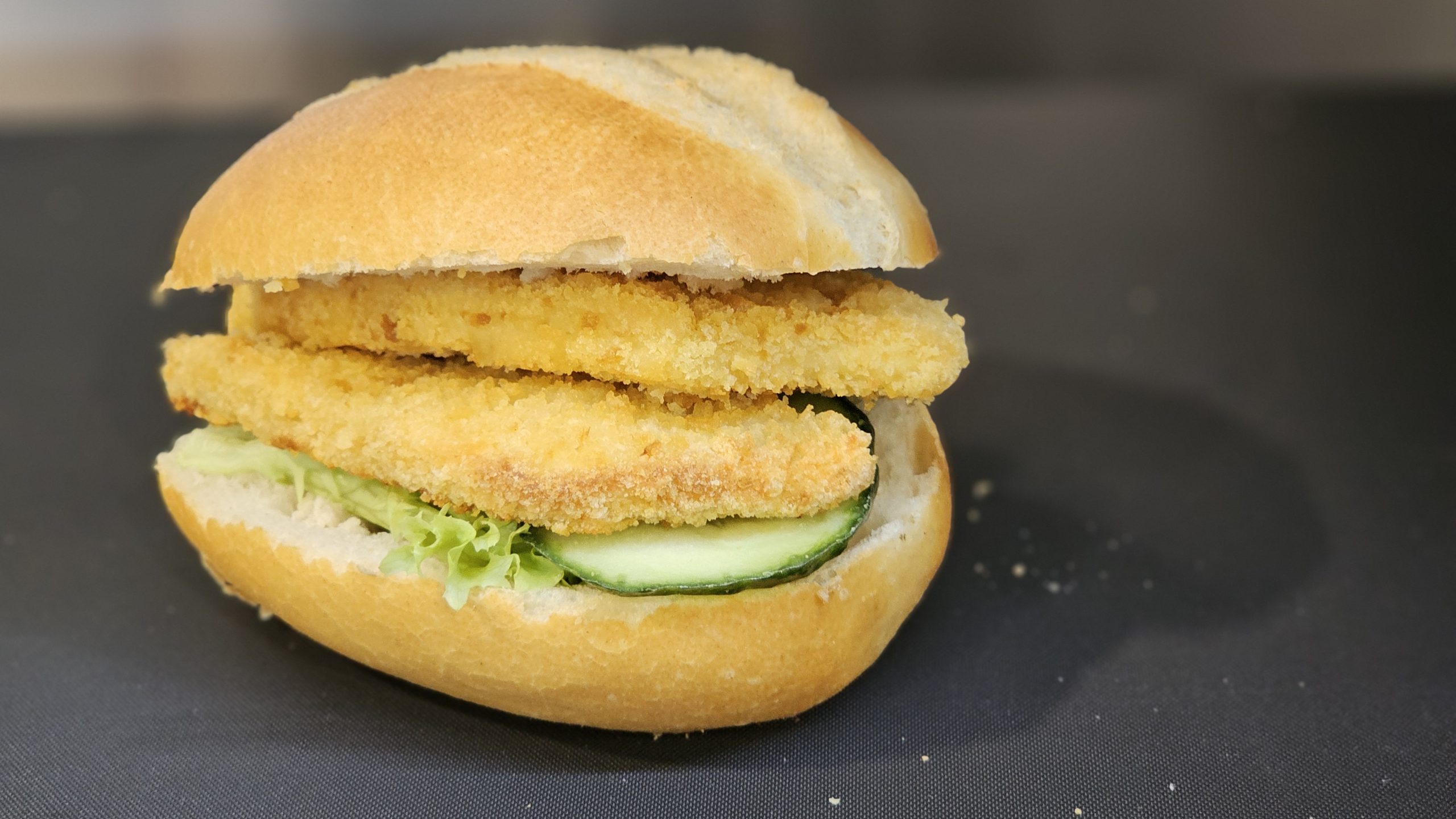 Leicht gebuttert, mit Lollo Bionda ausgelegt und einzeln mit Tomate und Gurke garniert.