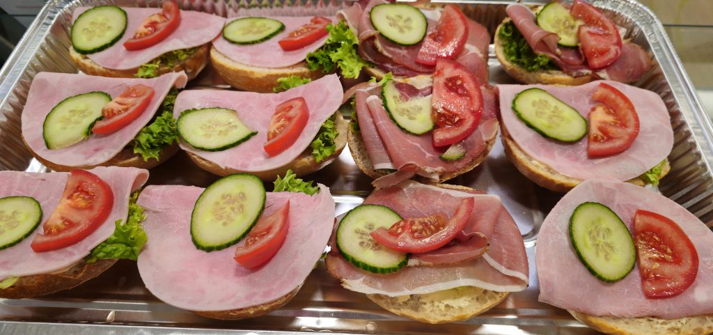 Brötchenplatten mit halben, belegten Brötchen.